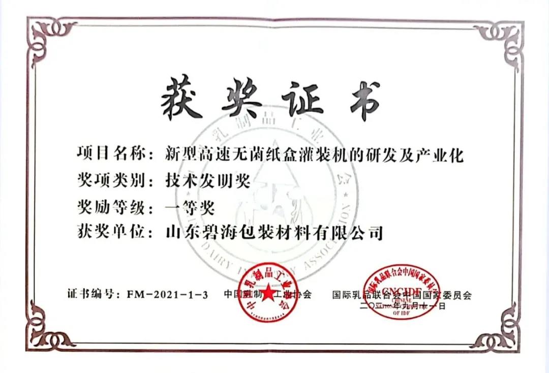 11日,在2021年度中國(guó)乳業(yè)科技系列頒獎(jiǎng)盛典上,碧海包裝又一新型高速無(wú)菌紙盒灌裝機(jī)獲技術(shù)發(fā)明獎(jiǎng)一等獎(jiǎng),公司執(zhí)行總經(jīng)理王立上臺(tái)接受頒獎(jiǎng)。